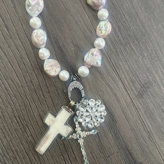 Iridescent Real Pearl Cross Necklace