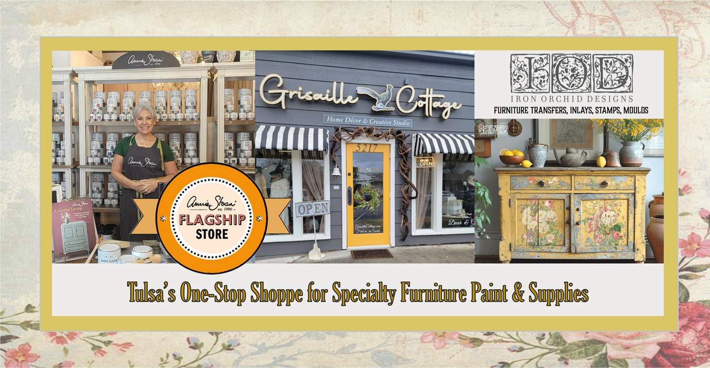 Grisaille Cottage in Tulsa Oklahoma is a U.S. FLAGSHIP STORE for the Annie Sloan Chalk Paint Collection, We also feature Full Lines IOD Iron Orchid Designs with Rub-On Furniture Transfers, Paint Inlays, Decor Stamps & Moulds, as well as the Entire Collection of FUSION Mineral Paint, Milk Paint & Alchemy, New, Bespoke, Vintage Decor, Gifts, Furniture, Jewelry & Jaded Gypsy Apparel and so much more!