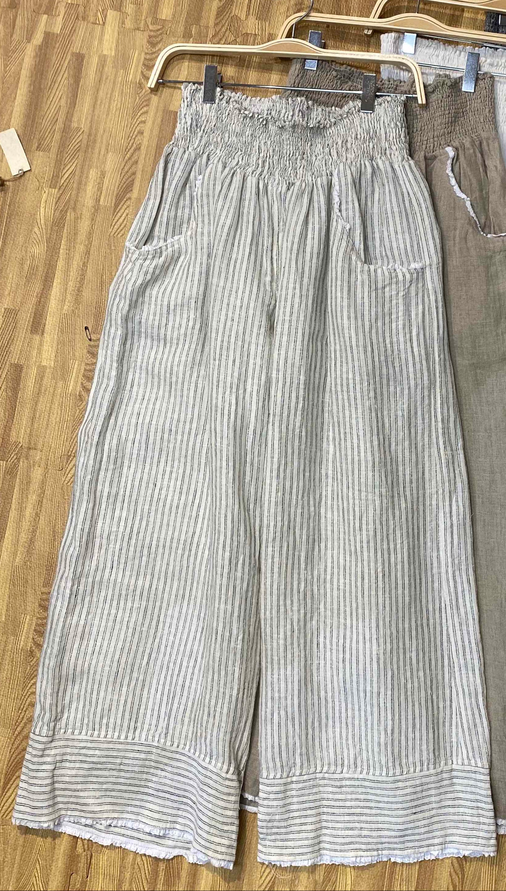 Experience the perfect blend of relaxed comfort and refined detailing with the Namsar Linen Smocked Parallel Pants—a versatile addition to any wardrobe. Elevate your wardrobe with the Namsar Linen Smocked Parallel Pants, where comfort meets artisanal elegance. Crafted from breathable linen, these pants feature a relaxed parallel-leg silhouette complemented by a smocked elastic waistband for a secure yet flexible fit. Delicate lace detailing adorns the side pockets and bottom hem, adding a touch of femininity and sophistication.