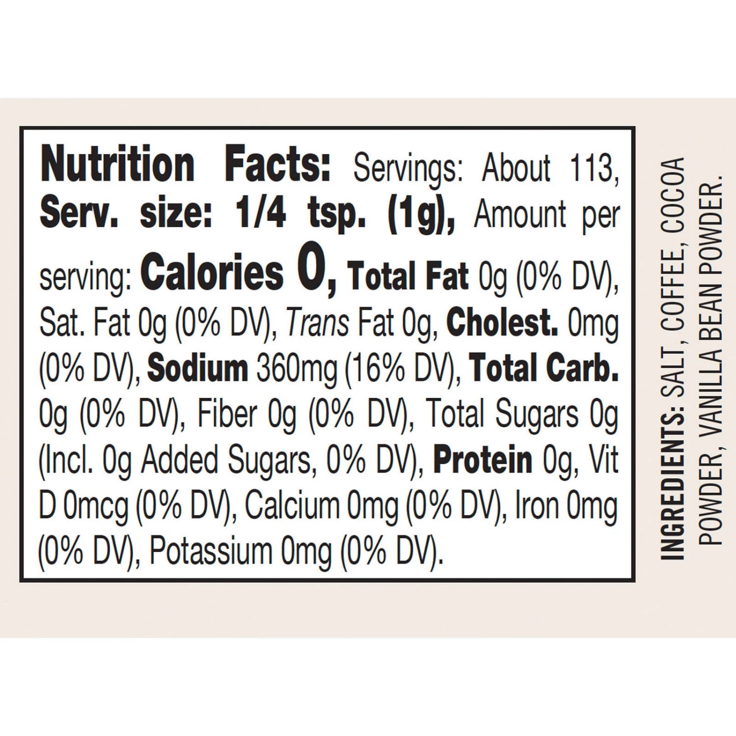 - Fragrant blend of bold ground coffee beans, alkalized cocoa powder, vanilla bean powder and natural sea salt