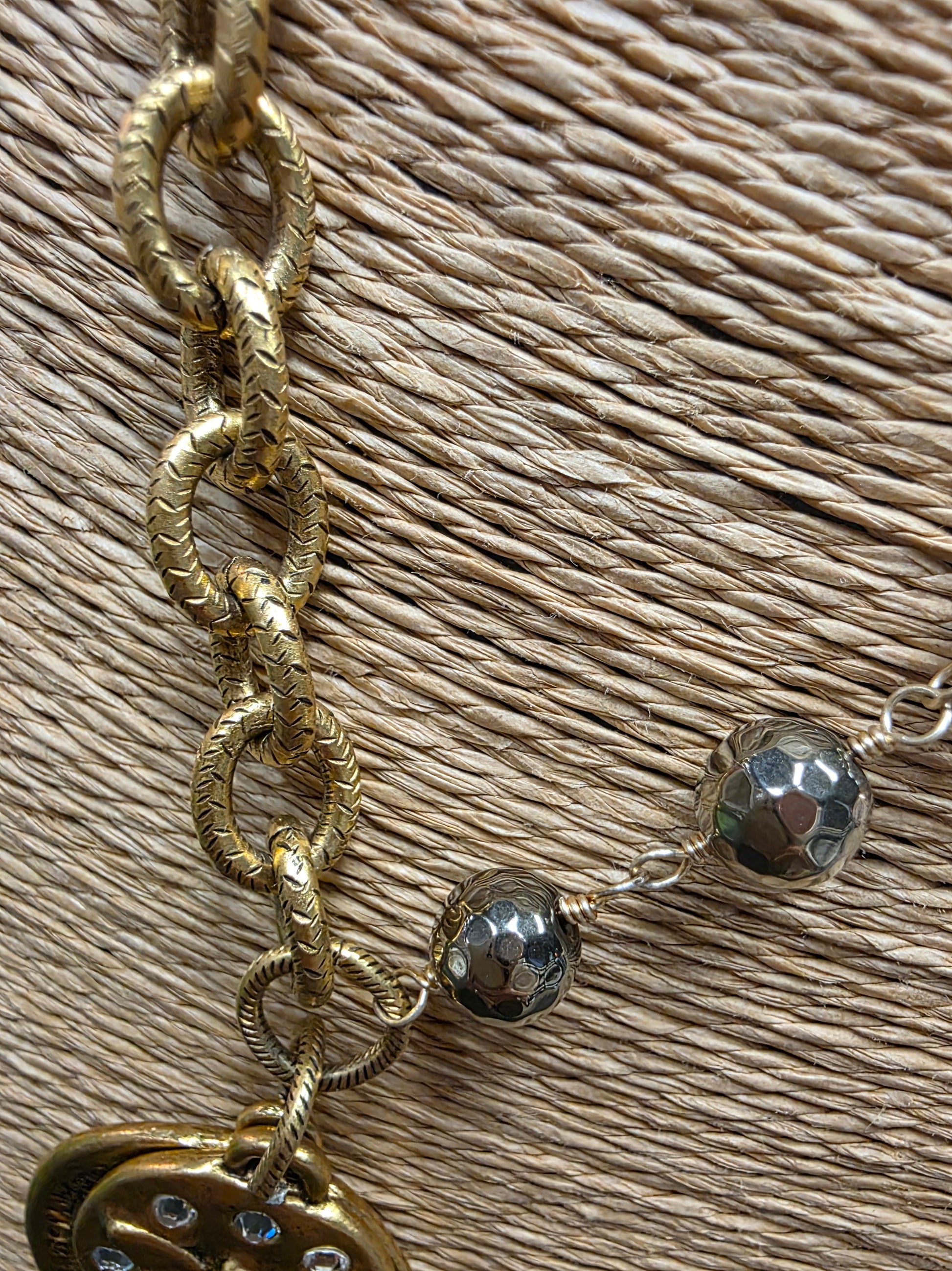 Handcrafted 24" Gold plated chain necklace with wrapped pyrite with gold plated medallion and crystal bee pendants