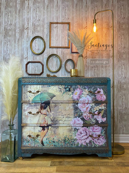 Come tiptoe through the puddles with us on this gorgeous new Fiber Paper design named, “Rainy Afternoon”! With soft pastels, wondrous layers, touches of lace, a smattering of watercolor florals, and the aqua coordinating umbrella, our rainy day gal will look beautiful on a dresser, bureau, canvas, and more! Never used our Decoupage Fiber Paper before? Do not worry! A high-quality material built on flexibility, ease of use and durability, our new Decoupage Fiber will surely give you incredible results and applications. Made of a high density, fibrous material, Decoupage Fiber is designed to be used on any surface, from furniture to walls, with a wrinkle-free surface that will provide incredible results. This tear-resistant, non-wrinkling, and ultra versatile material is compatible with most water-based mediums, and will completely blend into your surfaces without any cracking or warping. A budget-friendly option, Decoupage Fiber provides a beautiful and economical way to transform your surfaces and pieces, easily and affordably. Best paired with: Decoupage Gel, Mod Podge, other water-based sealants. Best used on: almost any surface including wood, canvas, concrete, plastic, glass, plaster, etc. 1 sheet, A1 sized