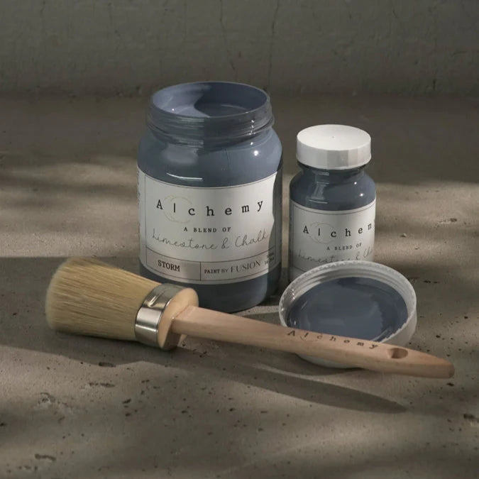 Alchemy by Fusion is a chalk-style paint known for its flat, chalky finish and artistic flexibility. It’s highly pigmented and a little thicker in texture, highly blendable, easy to layer and distress, making it perfect for achieving unique, textured looks. Adding a touch of water or misting while painting is a common desire among painters and it works very well with Alchemy. Fusion Mineral Paint has a very high built-in durability and a modern, self-sealing finish, Alchemy allows for creative freedom by letting you choose your preferred topcoat or leave it as is for a soft, flat vintage look.