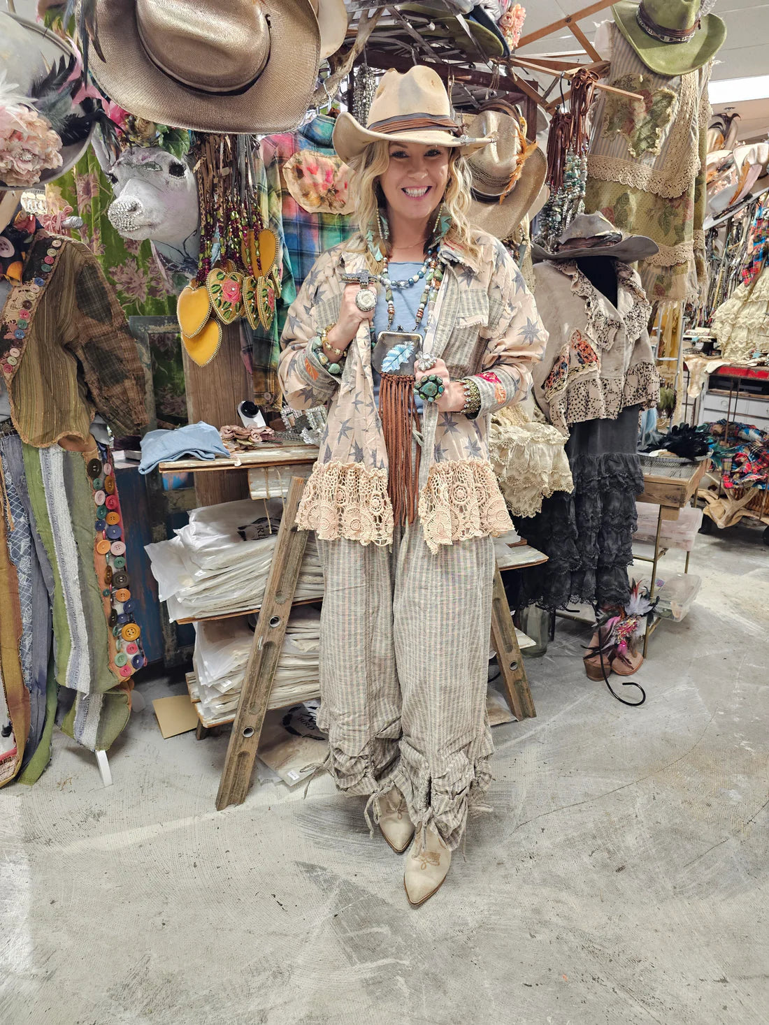A Rare Bird is Stitched, jeweled, patched, and sewn by hand. Be the gorgeous person in the room wearing A Rare Bird! A Go to Brand for a Farmgirl and Boho Chic Vibe with Generous Sizing, Meant to look loose fitting and Care-Free.