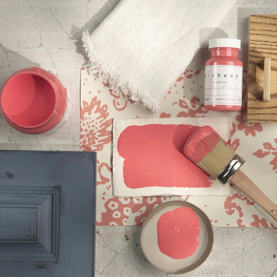 Alchemy by Fusion is a chalk-style paint known for its flat, chalky finish and artistic flexibility. It’s highly pigmented and a little thicker in texture, highly blendable, easy to layer and distress, making it perfect for achieving unique, textured looks. Adding a touch of water or misting while painting is a common desire among painters and it works very well with Alchemy. Fusion Mineral Paint has a very high built-in durability and a modern, self-sealing finish, Alchemy allows for creative freedom by letting you choose your preferred topcoat or leave it as is for a soft, flat vintage look.